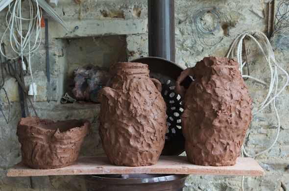 Je suis toujours étonné lorsque je commence à faire des pots, par le fait que les formes m’intéressent dès le premier colombin posé. Il y a quelque chose de primaire, de brut, qui fait qu’à chaque fois je me dis que je pourrais m’arrêter là. Faire juste des ébauches et garder ainsi toute la puissance évocatrice du début de la construction … Il est difficile de ne pas perdre l’énergie présente au départ … et bien souvent les formes perdent de leur singularité au fur et à mesure que le pot grandit. C’est peut -être dû au fait que les colombins s’affinent et que l’on perd l’effet de masse présent lorsqu’on les pose. Le travail consiste toujours à tenter de préserver cette sensation, d’un pot à peine ébauché qui semble pourtant dire tout ce qu’il possède de l’image d’un monde brutal et profond.
