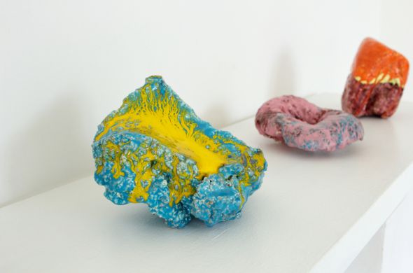 et me restent quelques images récurentes dans les yeux … Ecrire pour ne pas oublier. Pour être sûr que tout reste gravé. Ce Qui étonne d’abord ce sont les couleurs … inhabituelles, autant dans le travail de Coralie que dans l’ensemble de la production céramique … des émaux mats, par moments. Superposés sur des brillants. Des rouges, des roses qui rappellent les matières des cires fondues. Juxtaposés aux bleus, des jaunes sur-fondus posés sur des modelages devant leur formes à l’usage des paumes que je ne connais que chez Coralie. Les masses de terre sont pressées, empoignées à pleines mains, modelées dans la force des avant-bras. Peu de présence des doigts. Pas de rajouts. Des formes brutes, lourdes, adoucies par la sensualité aiguë des couleurs criées.