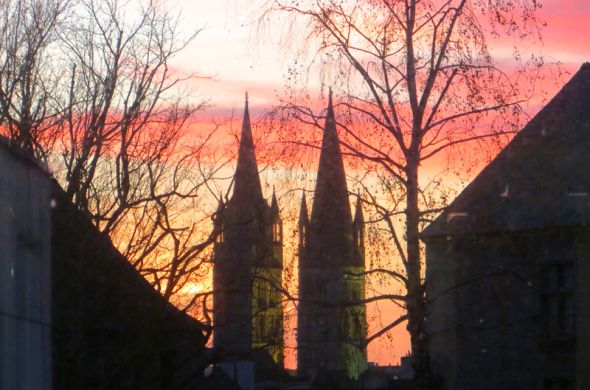 Le jour tombait quand nous avons quitté le musée et les flèches de l’église Saint Pierre de Caen s’érigeaient dans un ciel éclatant… comme sur une mauvaise chromo.