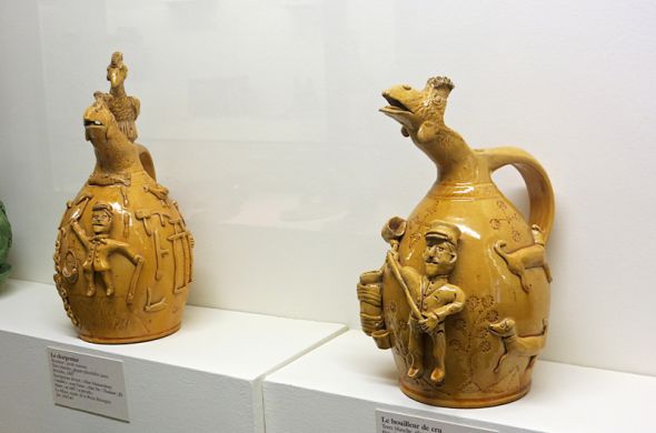 lorsque Claude Poli céramiste et professeur à Champigny sur marne, m’a emmené voir les pots de Louis leopold Thuilant au musée de la reine Bérangère au Mans. Et depuis, j’ai toujours gardé une grande admiration pour ce travail mi fantasque, mi documentaire … des pièces d’une grande naïveté et d’une gravité suintante rendant compte du travail singulier de ce potier qui, à l’orée de la guerre de 14, sombra dans une déprime sans merci. Toute son œuvre illustre des scènes de la vie rurale. Artisans au travail représentés avec leurs outils, leurs animaux de compagnie, dans des situations quotidiennes ornant la panse des pichets dont le col et le bec prennent formes d’animaux vaguement fantastiques. Le modelage est enfantin, riche et très émouvant. Fils de potier de terre vernissée à Prévelles, il réalise ses œuvres dans la droite lignée technique du travail de son père. Les pots sont monochromes, verts ou jaunes, émaillés au plomb.