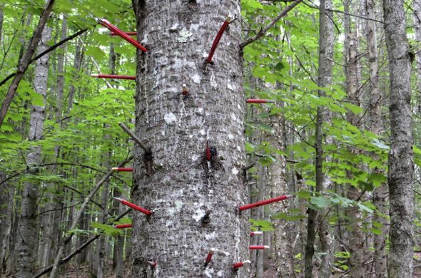 Nos pas nous ont portés aussi dans le symposium de sculpture des jardins précambriens de Val David (Québec) … là, comme partout dans ce type de symposium, on rencontre des oeuvres issues d’un certain académisme. Loin des premières expériences des artistes se confrontant à la nature, tout dans ce domaine est maintenant codifié. La plupart des pièces semblent faites pour faire ”une belle image” et peu tirent leur épingle du jeu. Il faut alors beaucoup de mots pour accompagner les oeuvres maladroites. Beaucoup de concepts approximatifs qui tentent de justifier les faiblesses apparentes, qui tentent de rattraper les effondrements… beaucoup d’effets démonstratifs pour justifier des actes posés sans nécessité. Peu d’oeuvres finalement nous amènent au silence, par leur simple présence au monde. Les plus réussies sont souvent les plus discrètes, alliant juste le concept nécessaire au risque du travail. À l’image de ces crayons plantés dans les arbres dont ils sont certainement issus autant que notre culture est issue de notre relation constante à la nature. À l’image aussi de ces petits assemblages de pièces antiques et de parties de moulages que Rodin faisait dans son atelier et que l’on a mis des années à comprendre comme une partie de son œuvre des plus prémonitoire de ce qu’allait, à sa suite, devenir la sculpture.