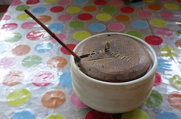 image : le sucrier de la maison - porcelaine, bambou et bois de pommier réparé au fil de laiton.